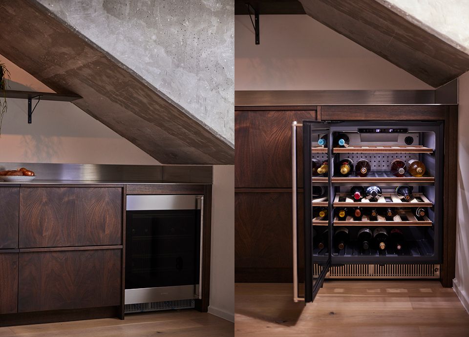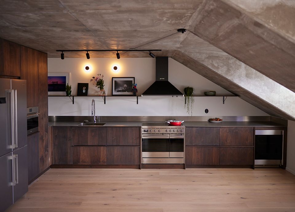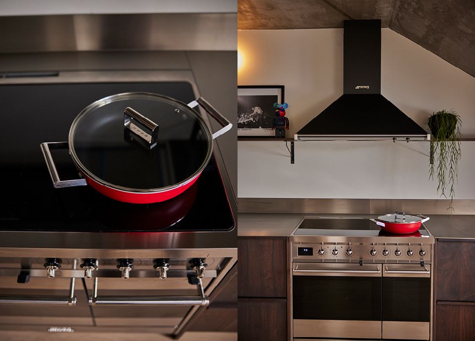 Vi ville have et socialt og indbydende køkken. Vi elsker at have gæster til middag herhjemme og kan godt lide, når vi alle kan lave mad sammen. Vi havde Smeg i vores tidligere lejlighed og var så tilfredse, at vi absolut ville have det igen. Vi synes også, det er utrolig flot med de rustfrie produkter sammen med betonloftet og trælågerne. Vi valgte et stort komfur med dobbeltovn, så man kan lave masser af mad samtidig.