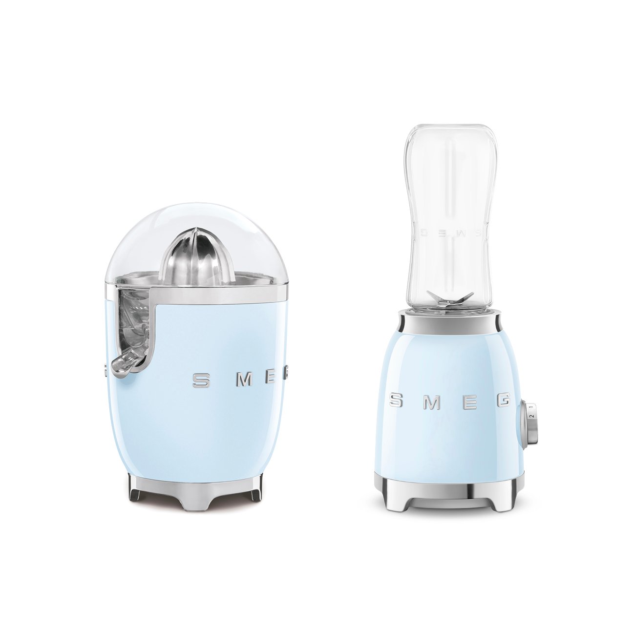 Pack de exprimidor y mini batidora de vaso Smeg en azul pastel. El dúo ideal para disfrutar de zumos naturales y smoothies en casa.