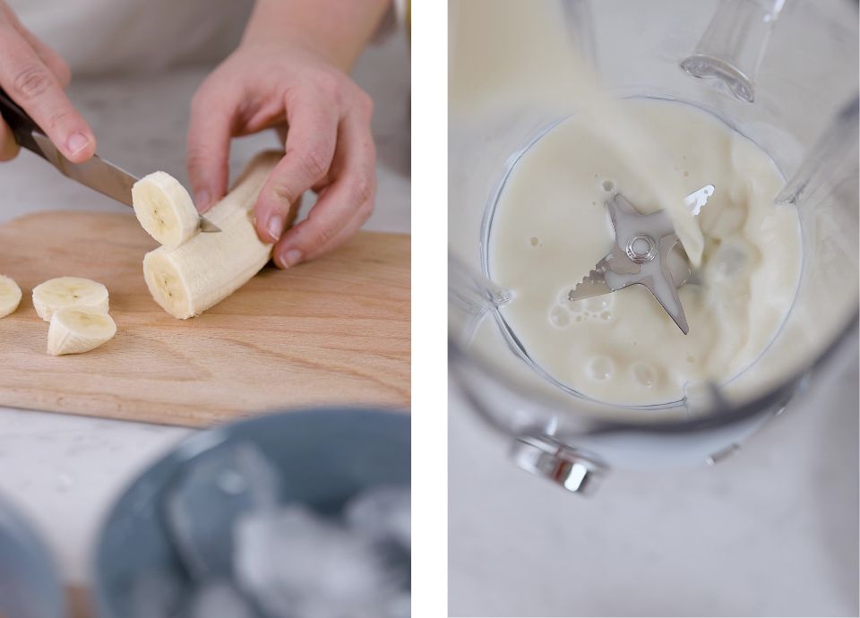Finalmente, añade las rodajas de plátano y el hielo.