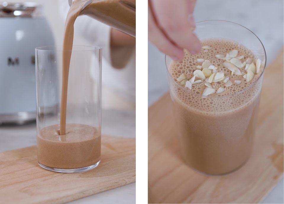 Cuando finalice el programa, vierte el batido en un vaso grande, añádele unos trocitos de almendra laminada y ya está listo para beber.