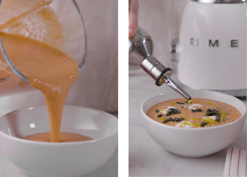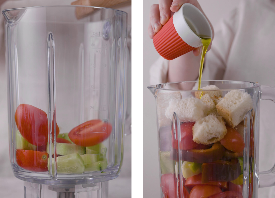 En la batidora de vaso, agrega los tomates, el pepino, el pimiento verde, la cebolla, el pan duro y los dientes de ajo.