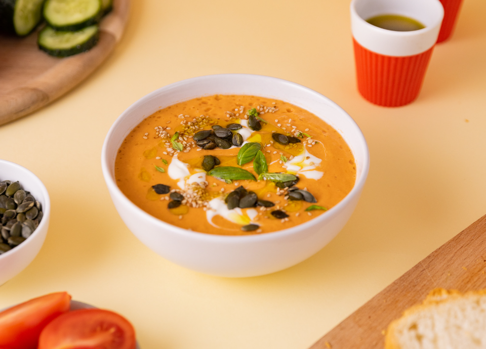 Lava y corta los tomates en trozos grandes. Pela y trocea el pepino. Lava y corta el pimiento verde en trozos, desechando las semillas y la parte blanca. Pela y corta la cebolla en trozos.