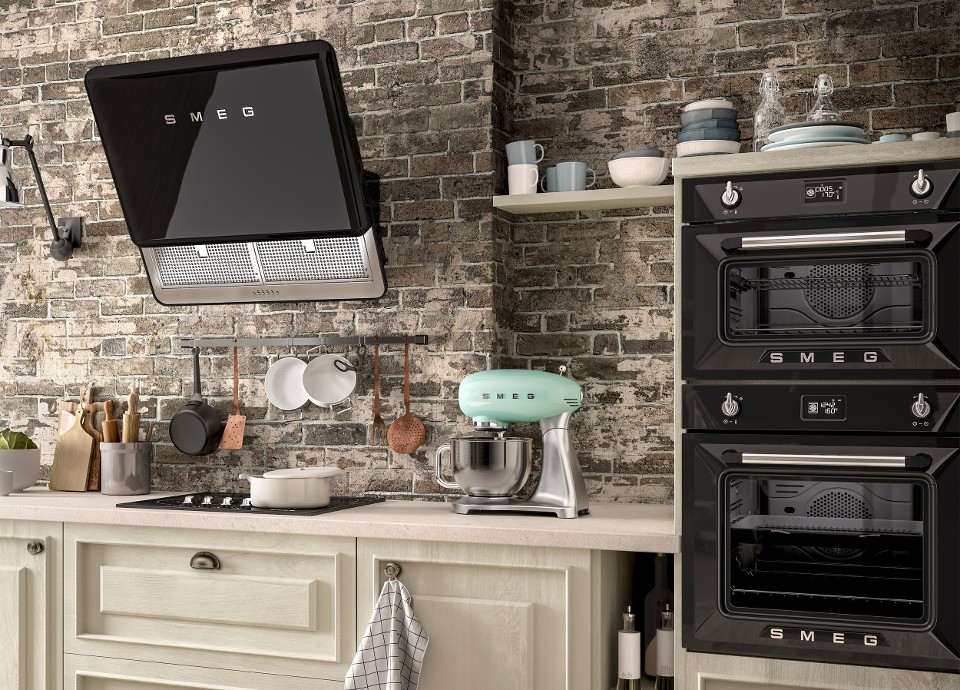 Dans la décoration contemporaine, la cuisine couleur encre reste en tête des choix de décoration. La tendance est au look totalement noir, qui concerne également le revêtement mural. L'évier en granit s'intègre parfaitement au plan de travail et est antibactérien, résistant aux rayures et aux chocs thermiques. Pour le compléter, l'une des nouveautés de Smeg est le mitigeur à jet unique en laiton noir.