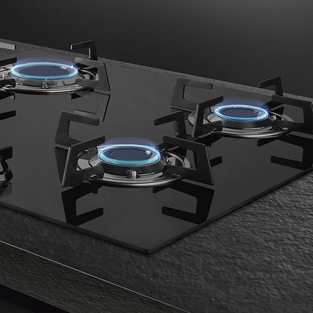 Les brûleurs à flamme annulaire possèdent des flammes verticales très élégantes, brevetées SMEG, qui sont 30% plus performantes que les flammes des brûleurs traditionnels, grâce à leur formes verticales qui permettent une cuisson plus rapide et plus homogène. Les brûleurs se démontent très facilement pour pouvoir nettoyer tout en simplicité les différentes zones de cuisson, tandis que les grilles en titane résistent à de hautes températures allant jusqu'à 1100°C.
