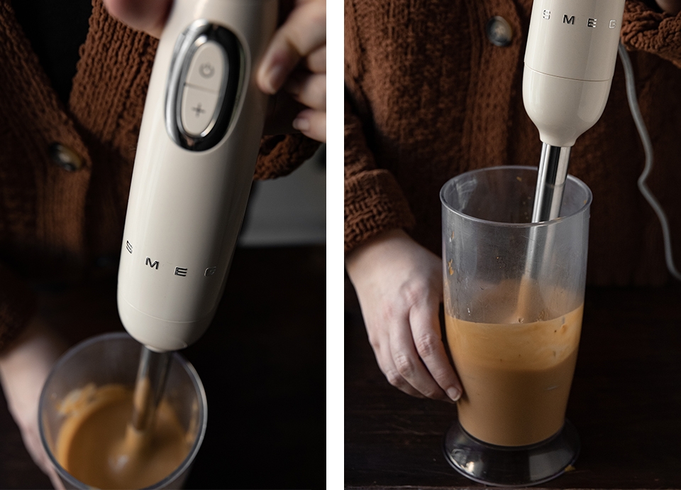 Quando sarà bella fredda, mettete in un boccale la polpa di zucca, la panna, lo zucchero Muscovado, l’uovo e le spezie e frullate fino ad ottenere una consistenza omogenea.