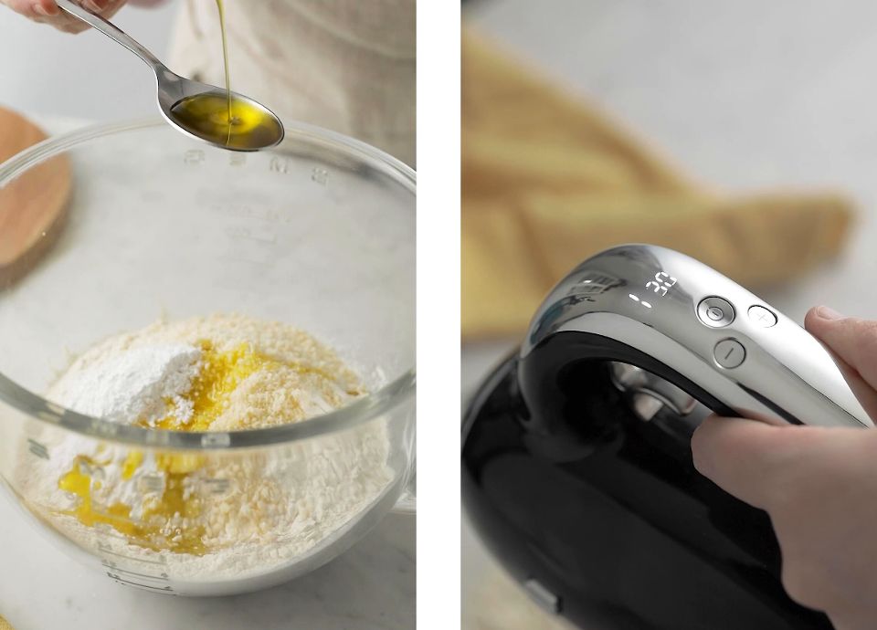Despeje a farinha, o queijo ralado, o fermento, o sal, o azeite e a água numa tigela grande.
