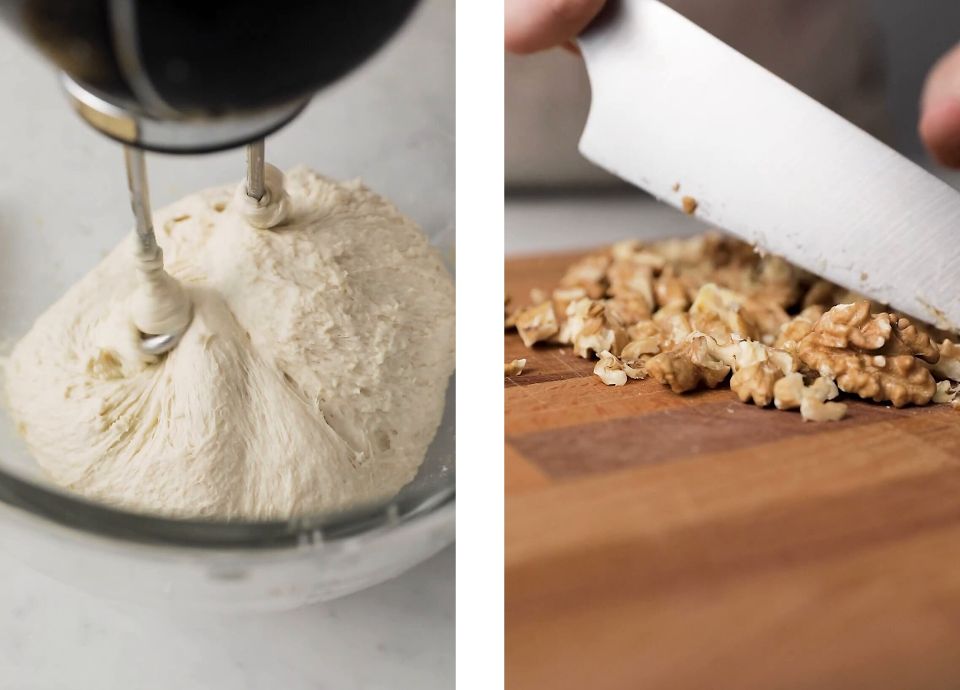 Com a batedeira na velocidade mais baixa, utilizando os ganchos, amasse durante 7 minutos.