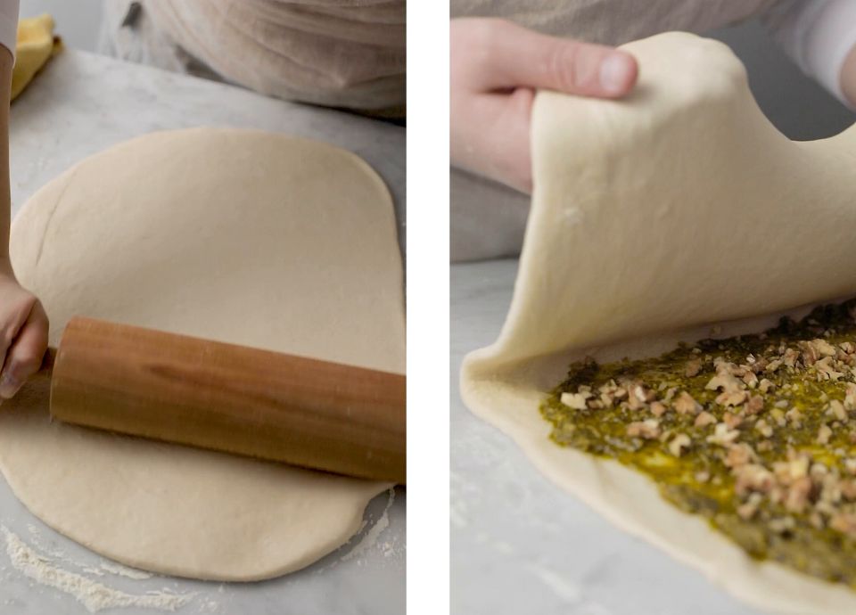 Espalhe o pesto em metade da massa, espalhe as nozes, e sele bem as bordas.