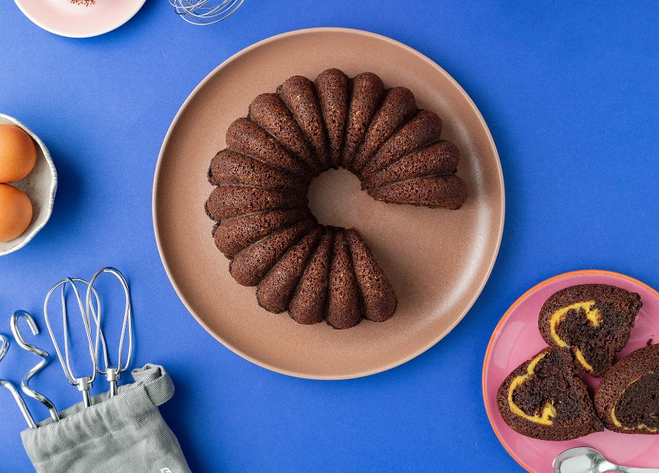 Numa tigela, peneire a farinha, junte o cacau e o fermento, e misture.