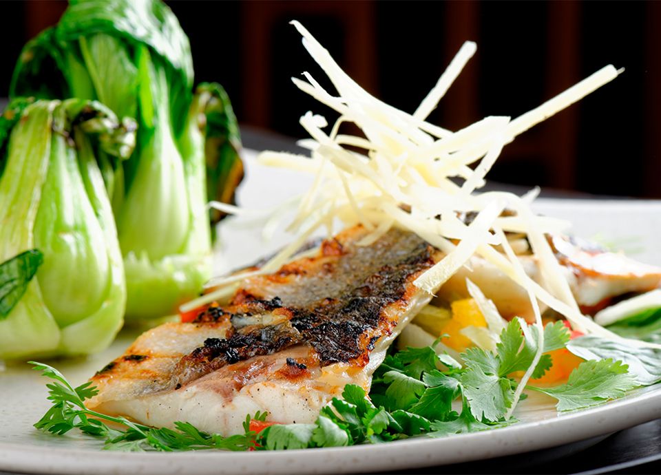 Season the sea bass by inserting the chopped aromas inside. Salt and oil the skin and place in the oven on the plate side of the BBQ. Do not turn the fish during cooking.