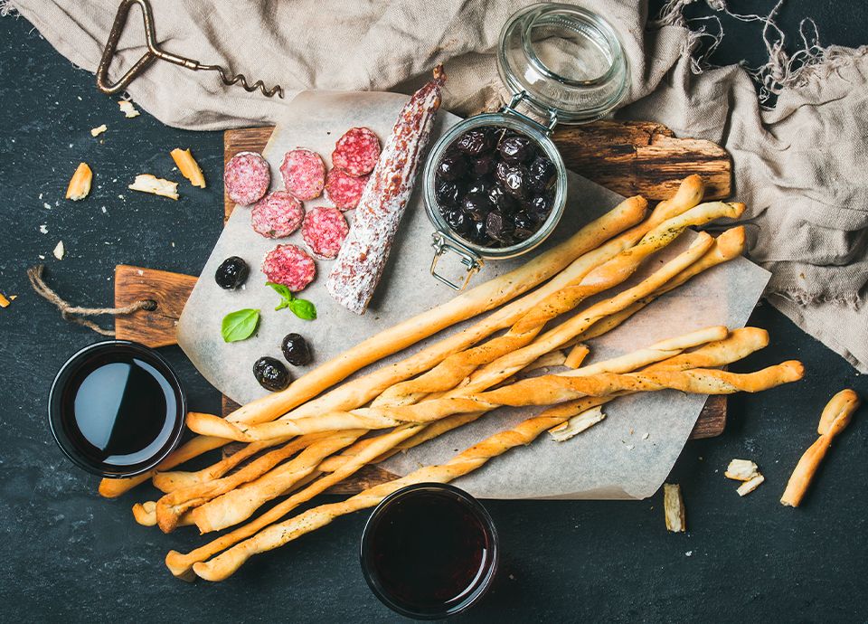 Crispy homemade breadsticks made with simple dough, brushed with olive oil and baked on a hot stone. Perfect as a snack or appetiser.