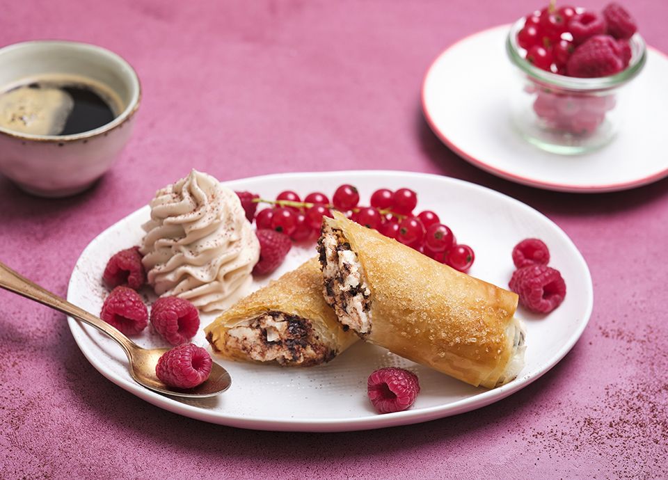 Crispy and golden, this phyllo strudel is filled with sweet ricotta and chocolate chips, then served with whipped cream and fresh red berries. Light, creamy and full of contrast, it’s an elegant dessert with a delicate crunch.
