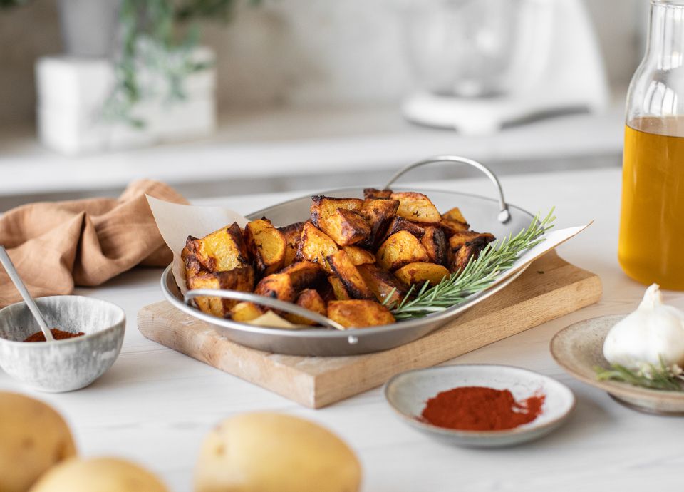 Spicy and crispy oven-roasted potatoes seasoned with paprika, garlic, rosemary, and chili. A flavourful and easy side dish perfect for any meal.
