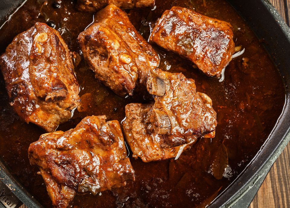 Pork ribs coated in seasoned flour, browned and steamed with vegetables, wine and tomato. Tender and aromatic with a rich, savoury flavour.