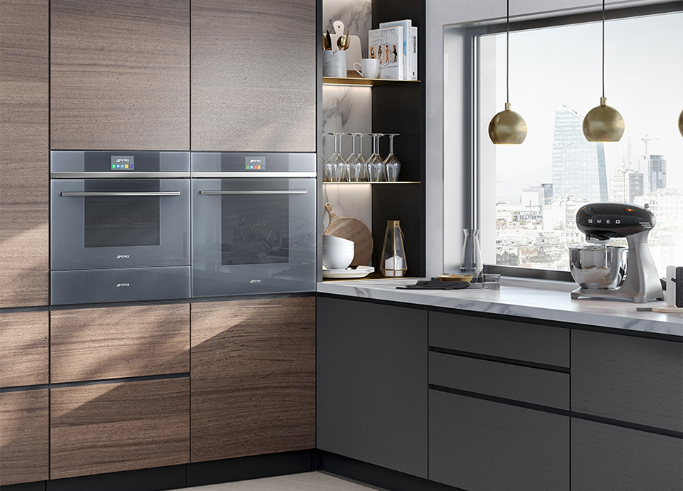 Consisting of products developed by SMEG's internal design studio, and characterized by an ergonomic and balanced style, Linea-style wall ovens, speed ovens, and steam ovens stand out for their minimalist style, and space-optimized designs.  Of particular notice are the handles, touch screen controls, and the remarkable use of glass of staid "Mystic Gray" glass.  Combined with stainless steel elements, Linea truly stands out in any modern kitchen.